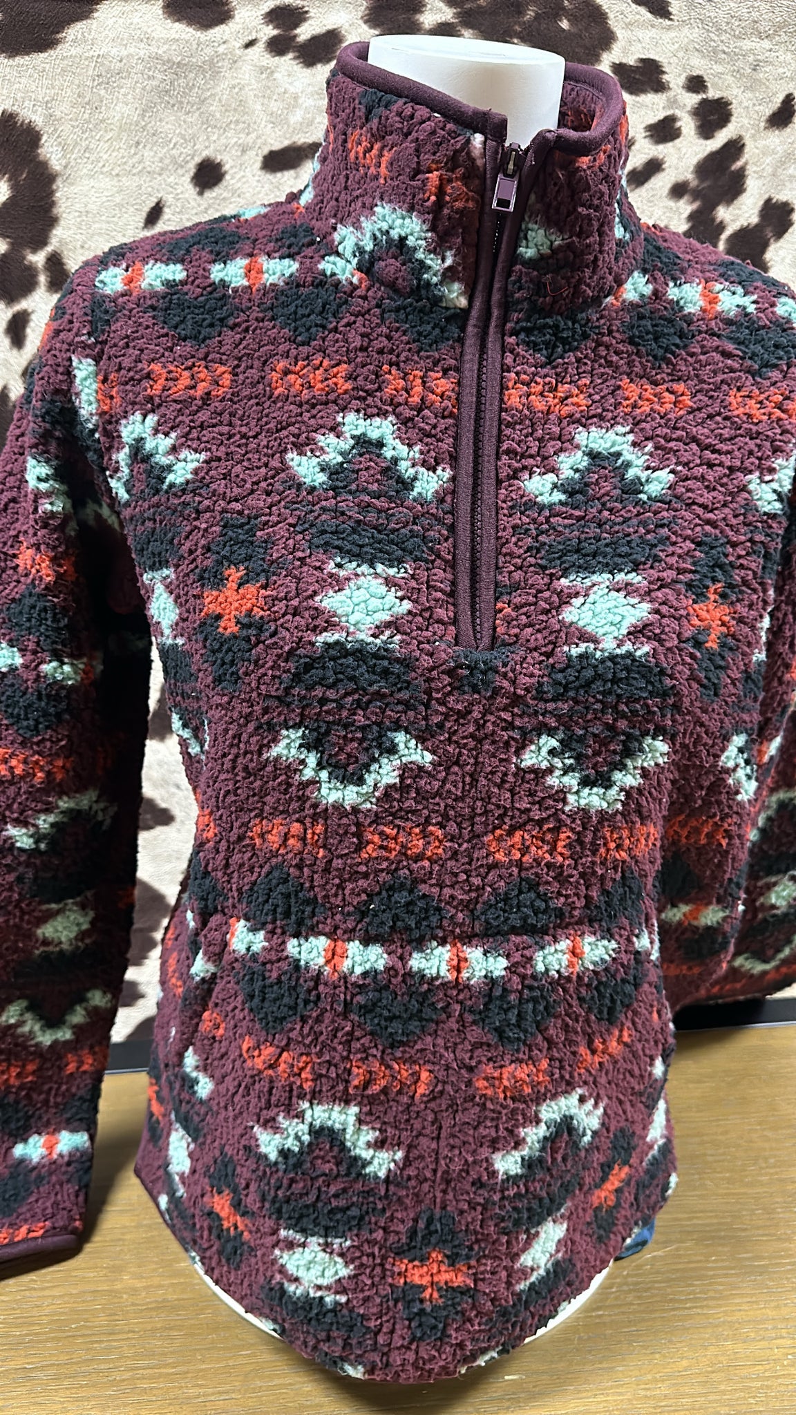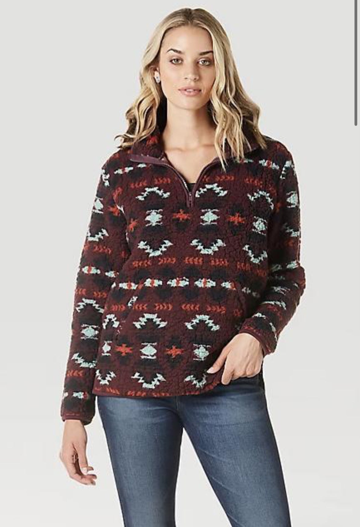 Women's Wrangler Retro ladies Southwestern Print Quarter-zip Sherpa Pullover - wine