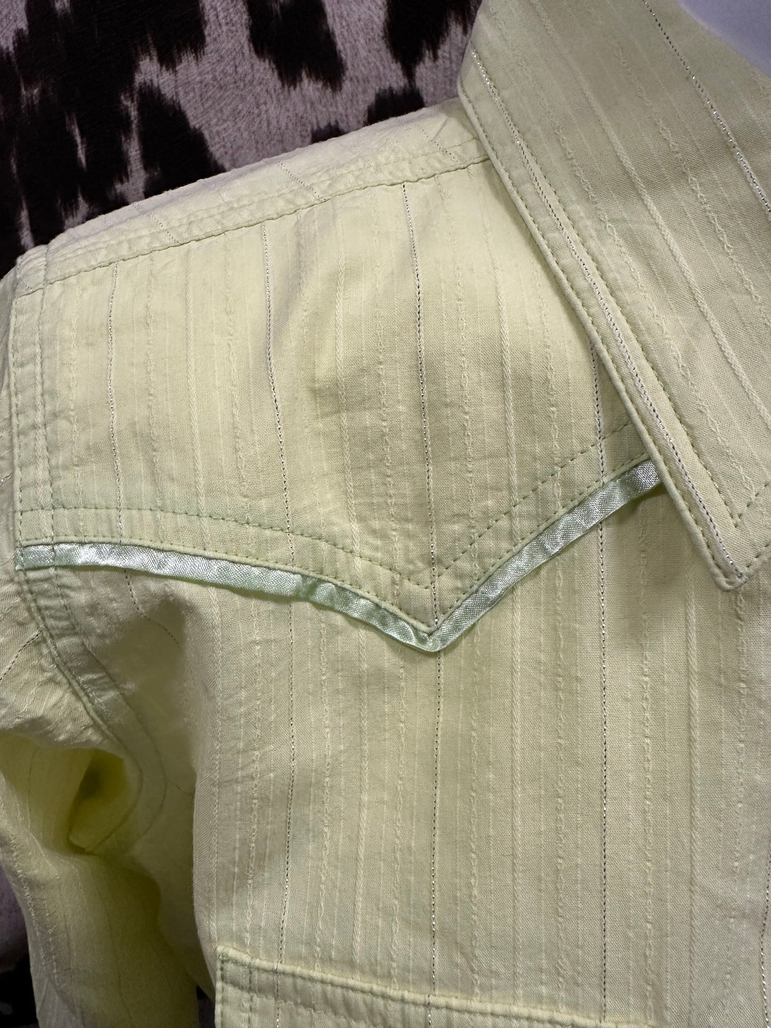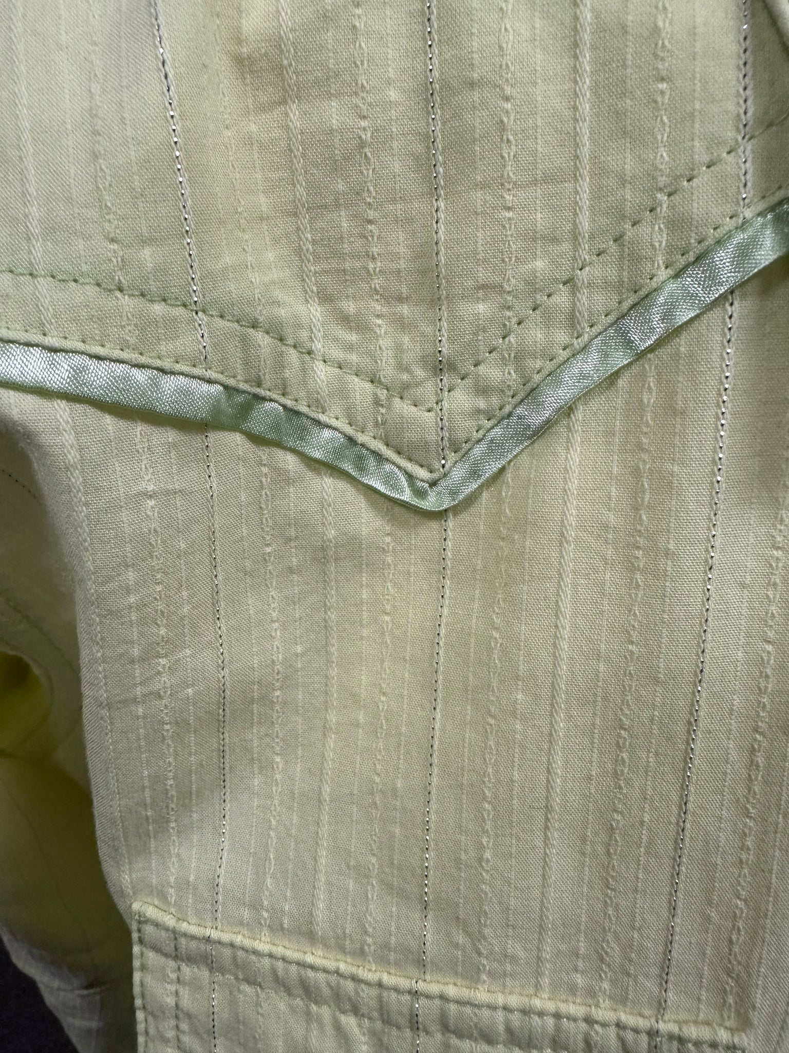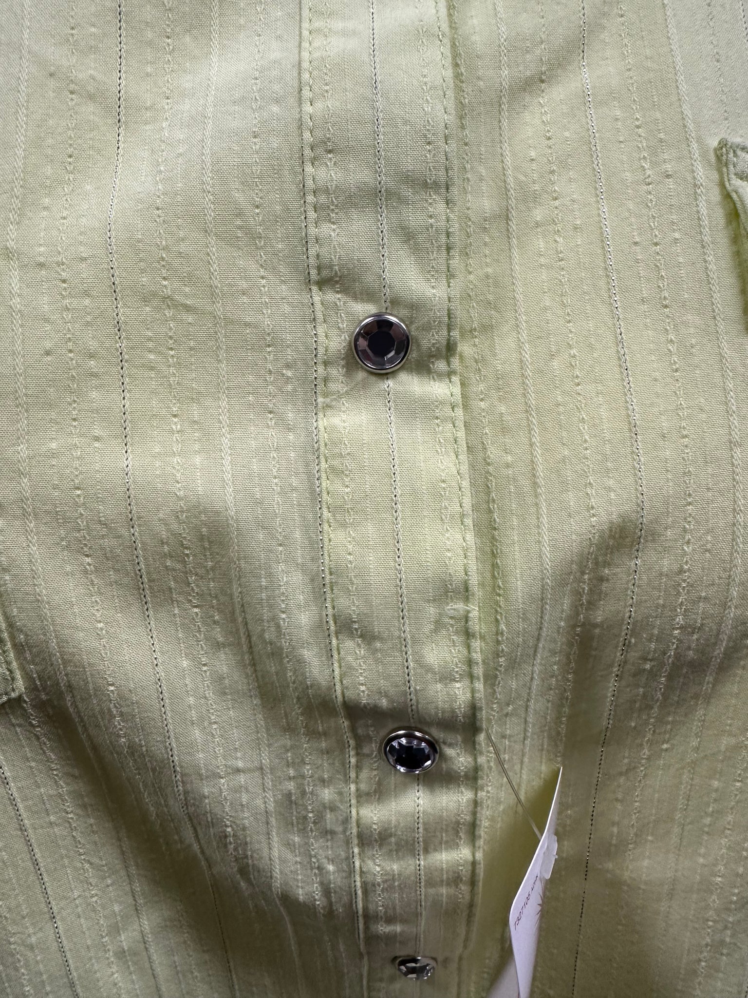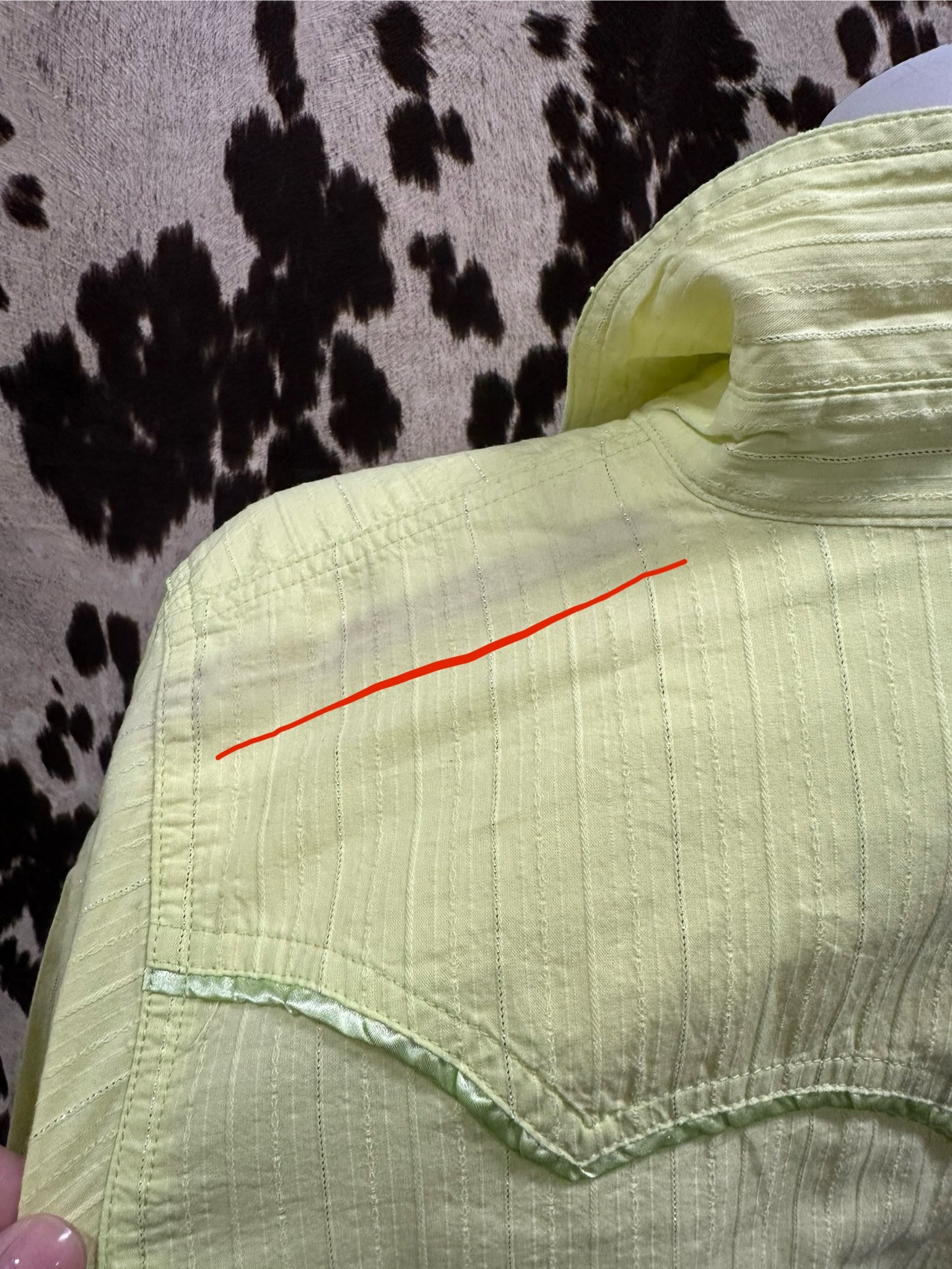 This shirt is brand new but does have sun discoloration along the shoulders and edges and inner collar, where it was hung. The discoloration appears as faint outlines of the hanger and is visible. We've included close-up photos for clarity. Despite these minor imperfections, the shirt is in excellent condition overall and is offered at 71%  off due to this small flaw, making it a great deal for a high-quality, unique piece.