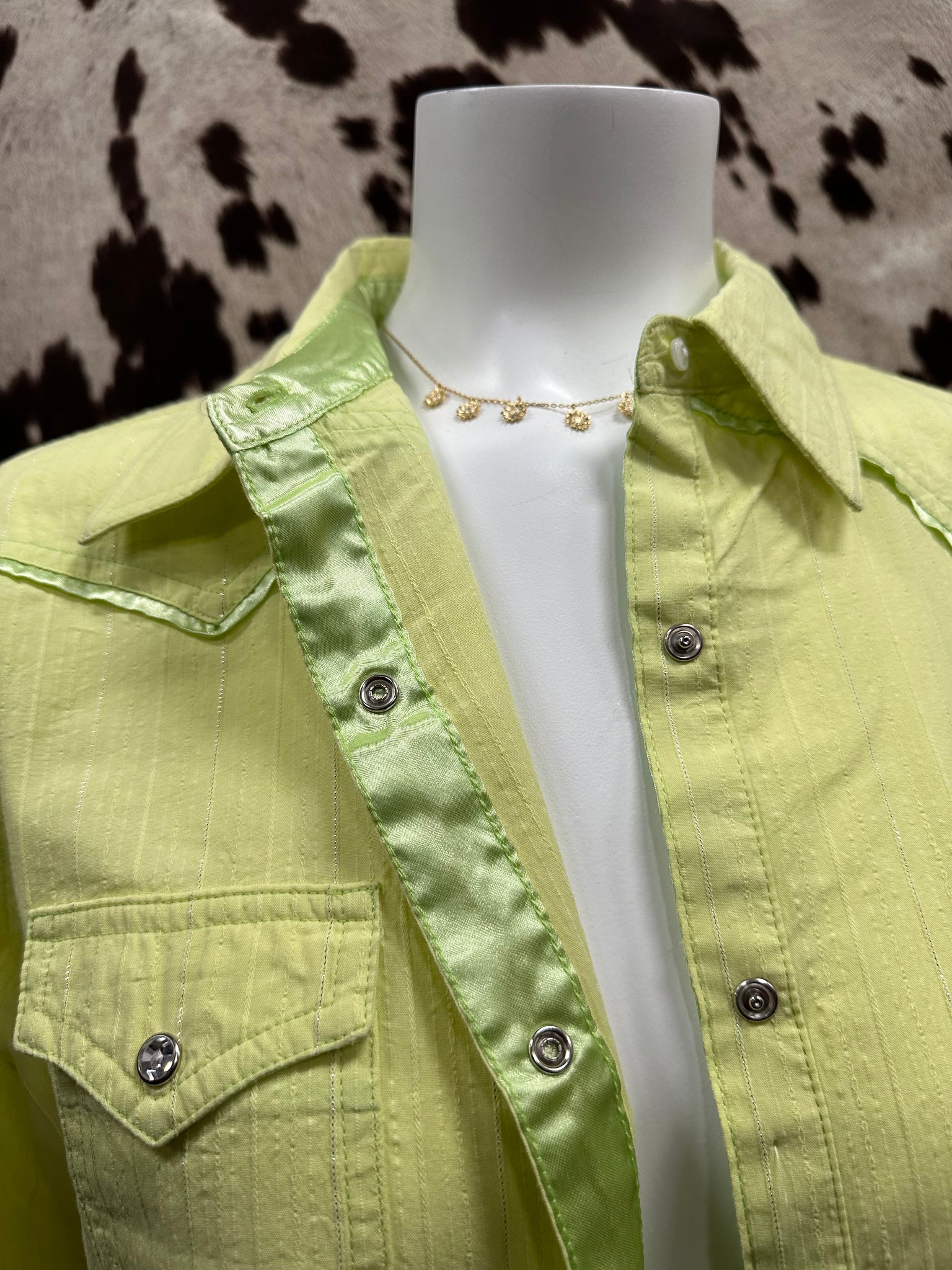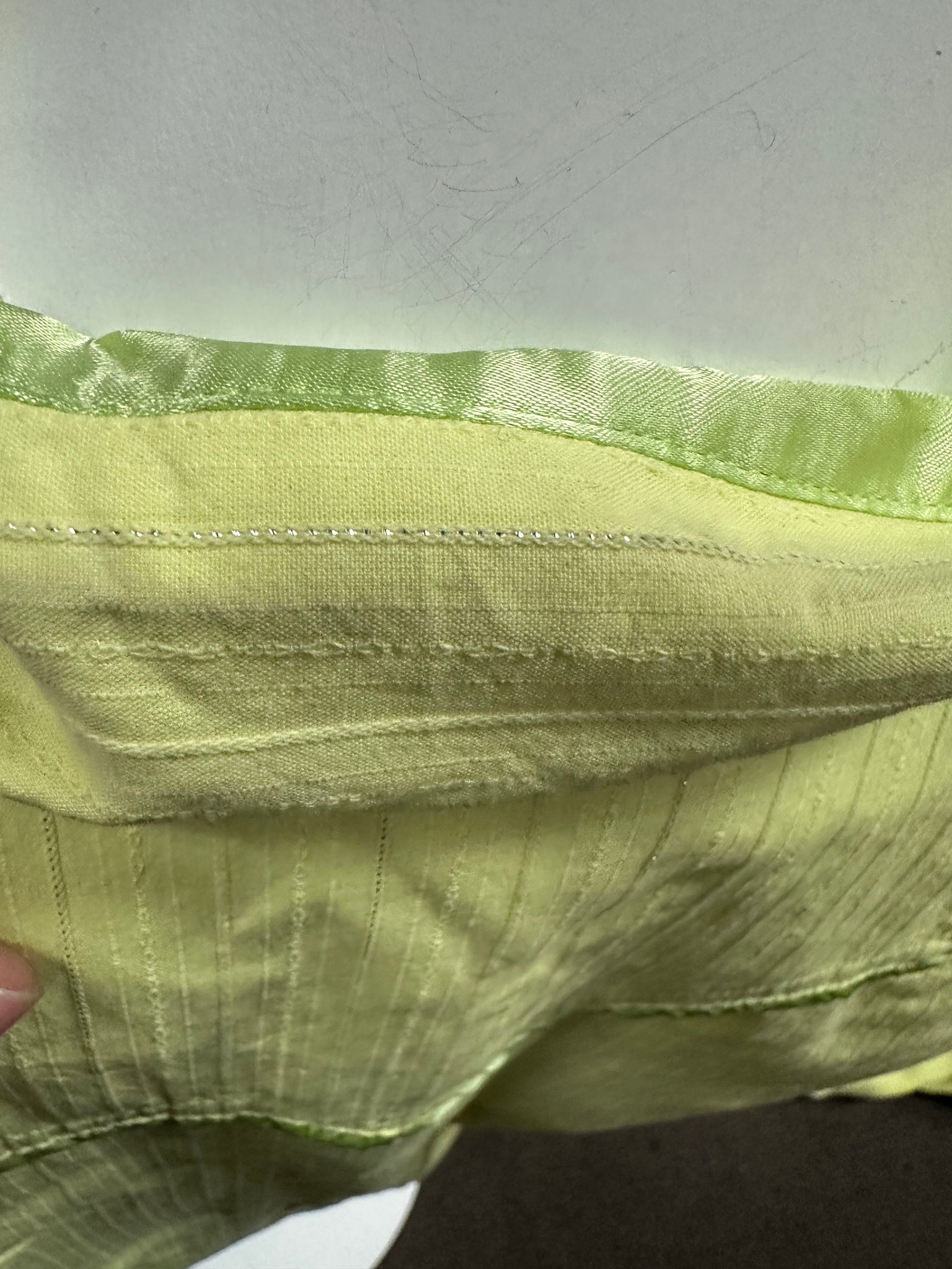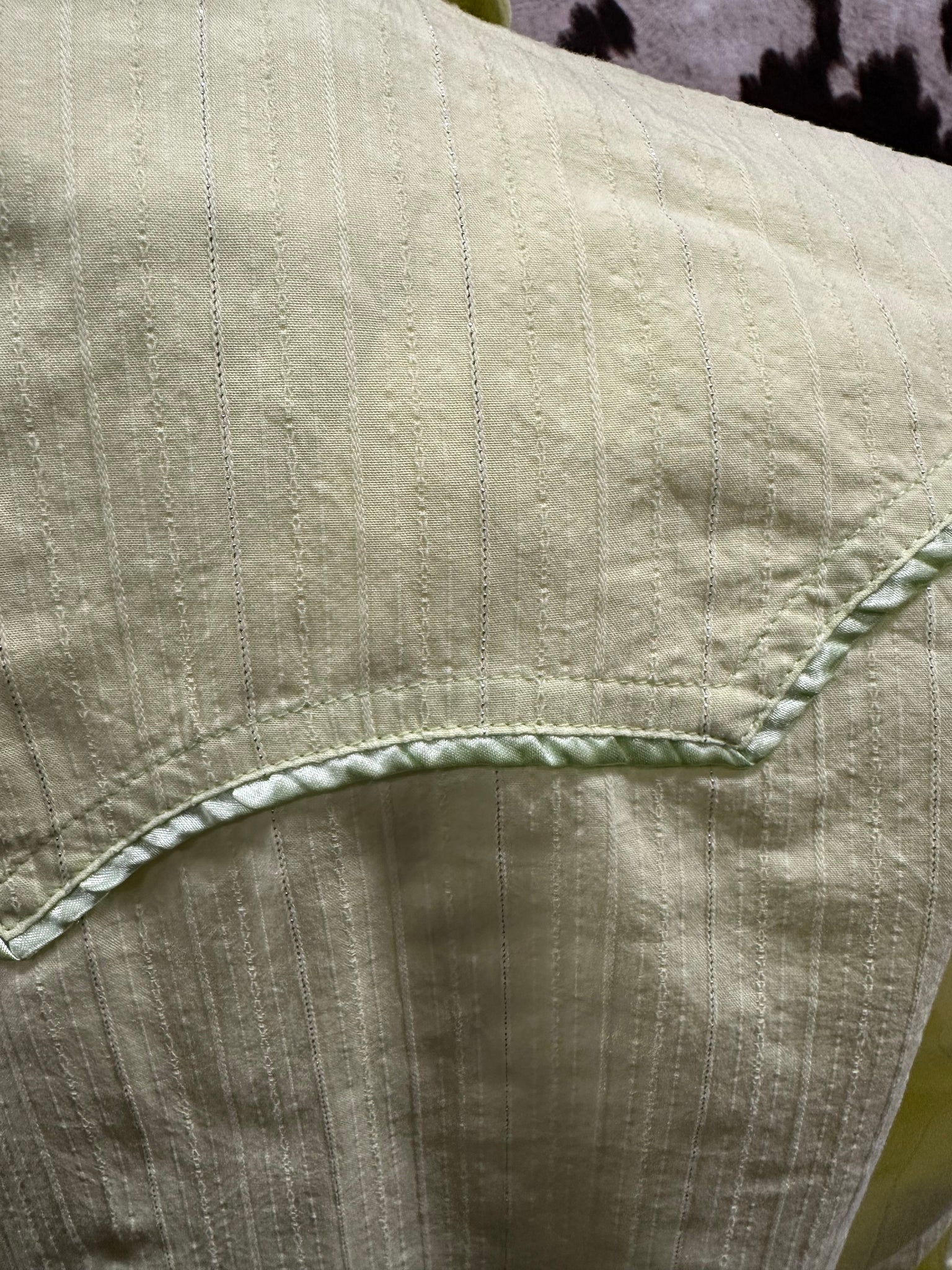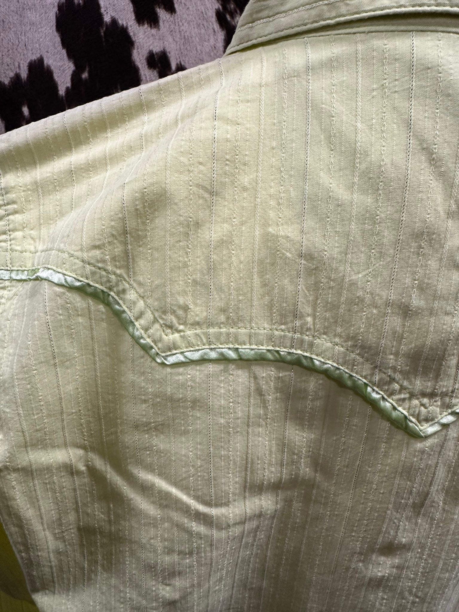 This shirt is brand new but does have sun discoloration along the shoulders and edges and inner collar, where it was hung. The discoloration appears as faint outlines of the hanger and is visible. We've included close-up photos for clarity. Despite these minor imperfections, the shirt is in excellent condition overall and is offered at 71%  off due to this small flaw, making it a great deal for a high-quality, unique piece.