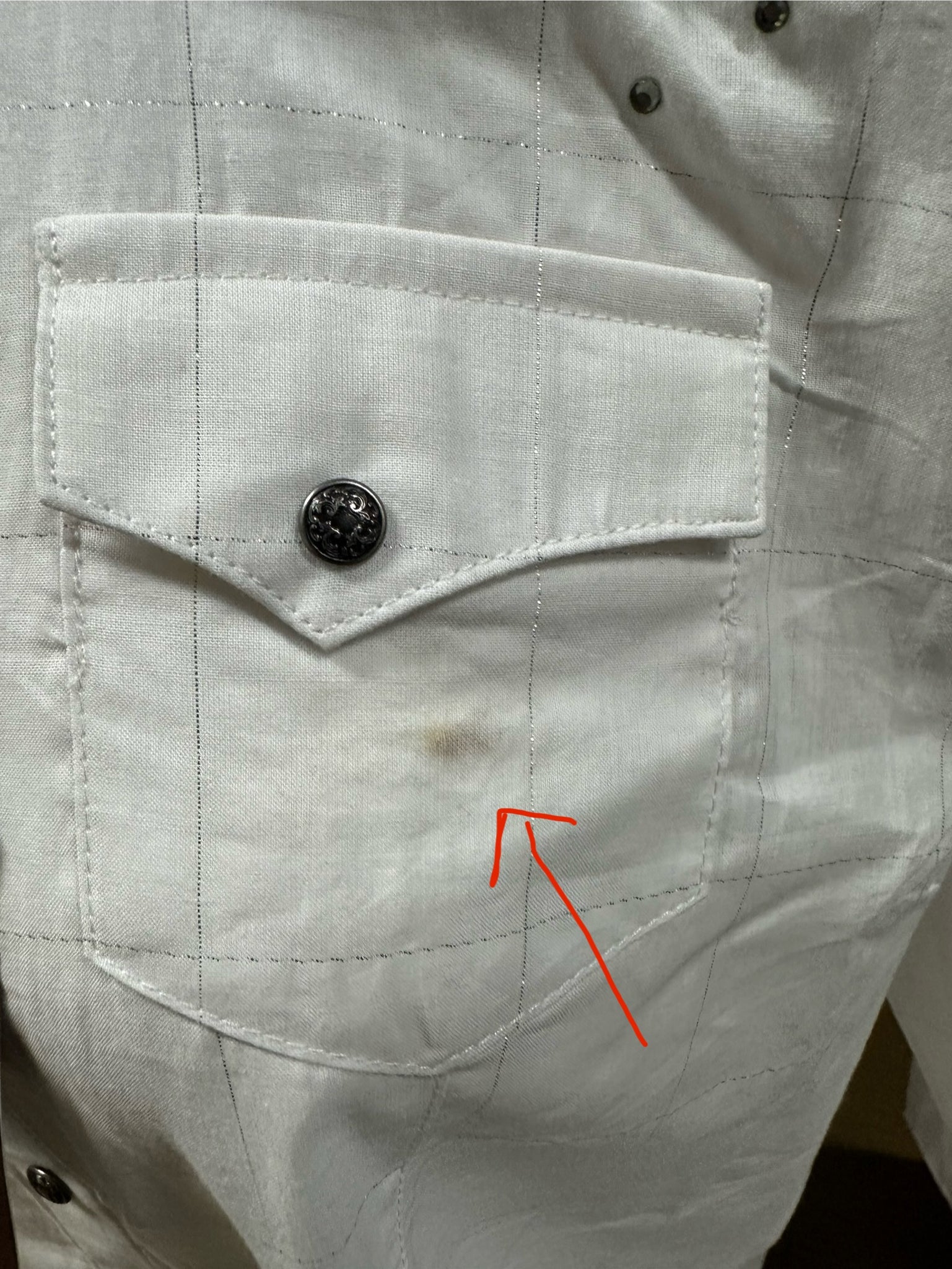 • Condition: Visible stain on left front pocket, noticeable hanger line (please see photos for details) Shirt is discounted and final sale