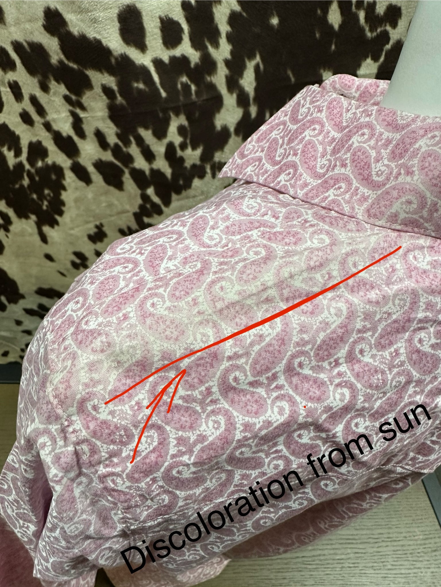 Condition: New but there is some visible sun fading on both shoulders where the shirt rests on the hanger ( see photos for details). For that reason, it's discounted and final sale.