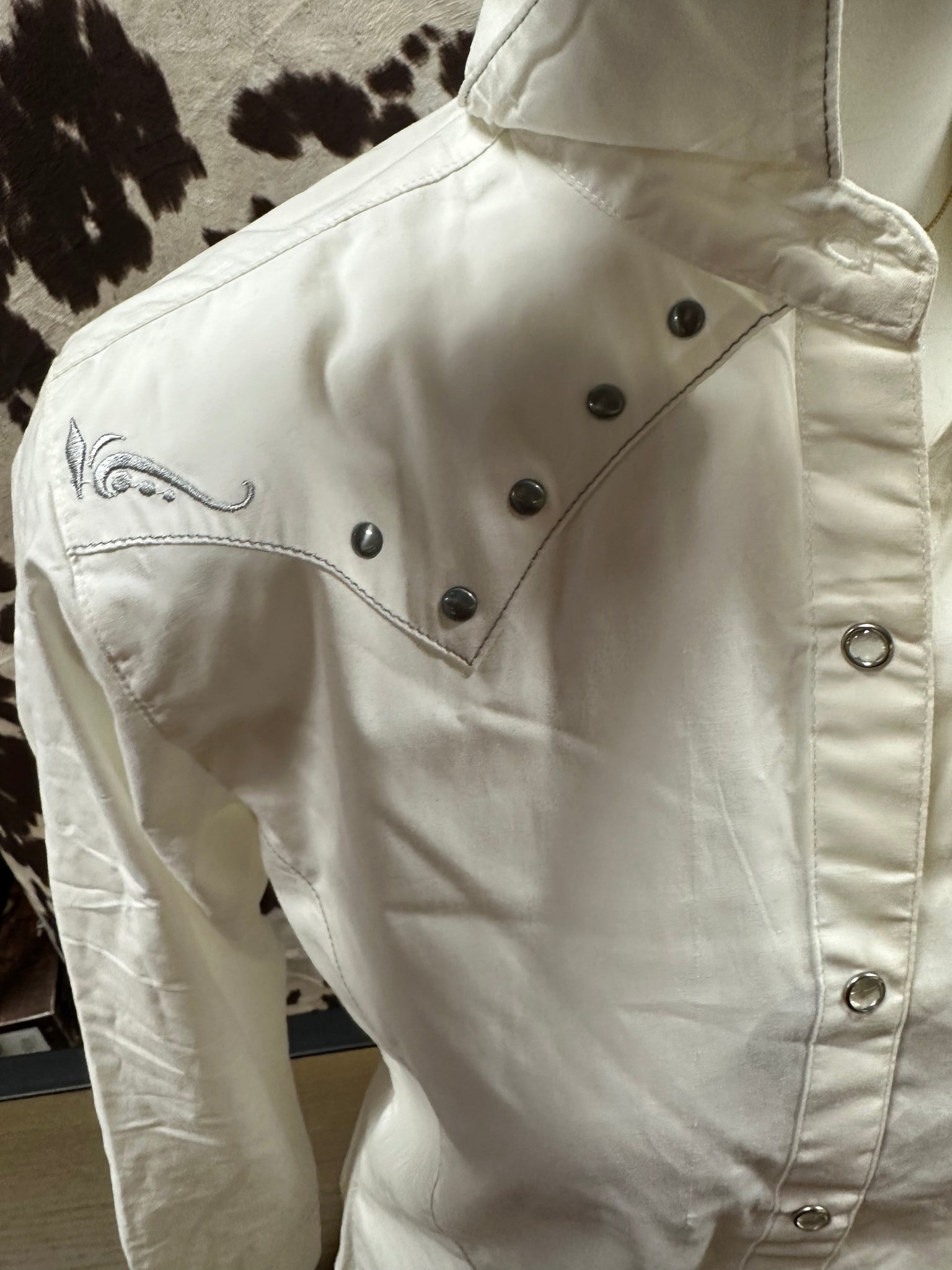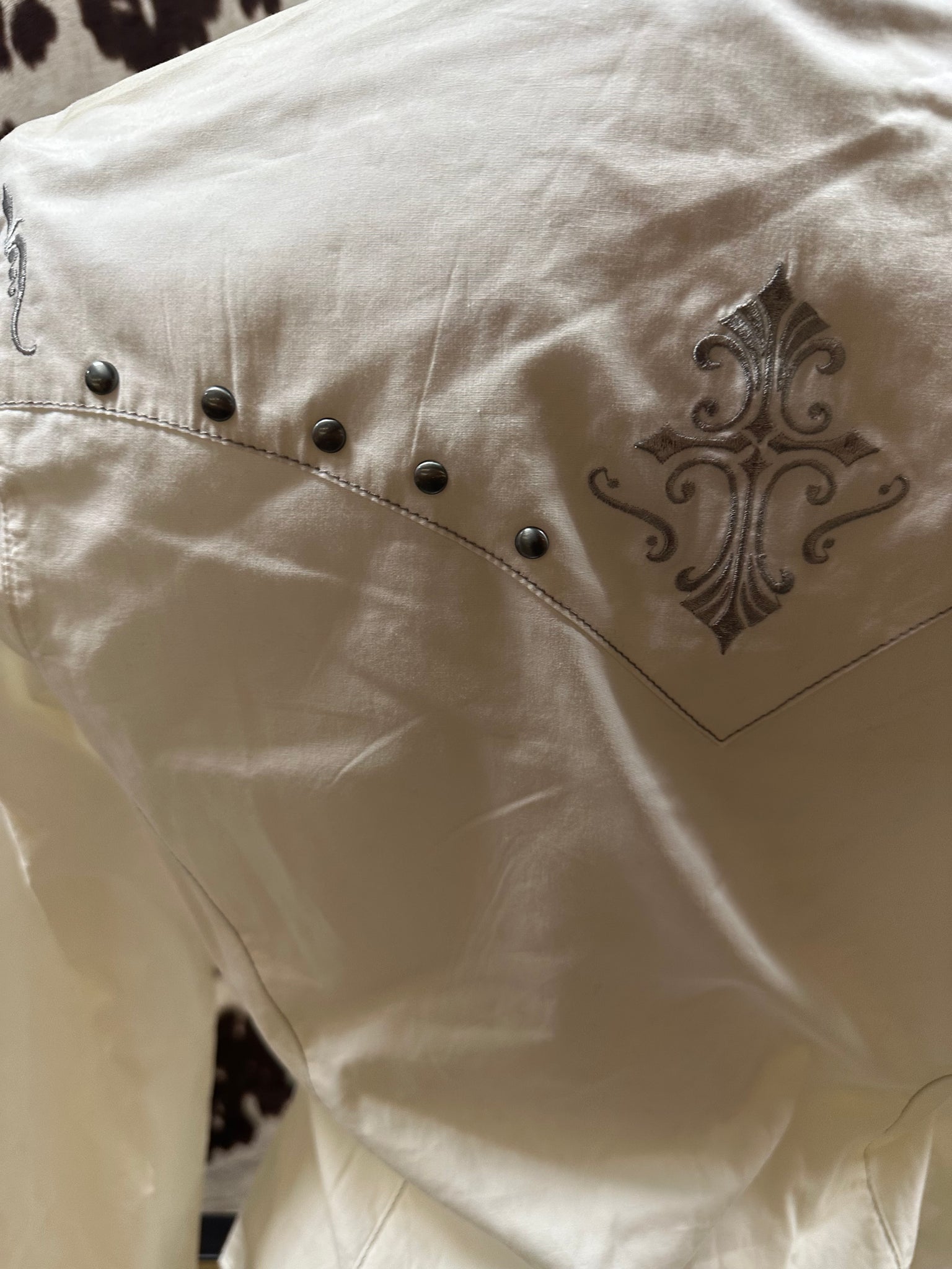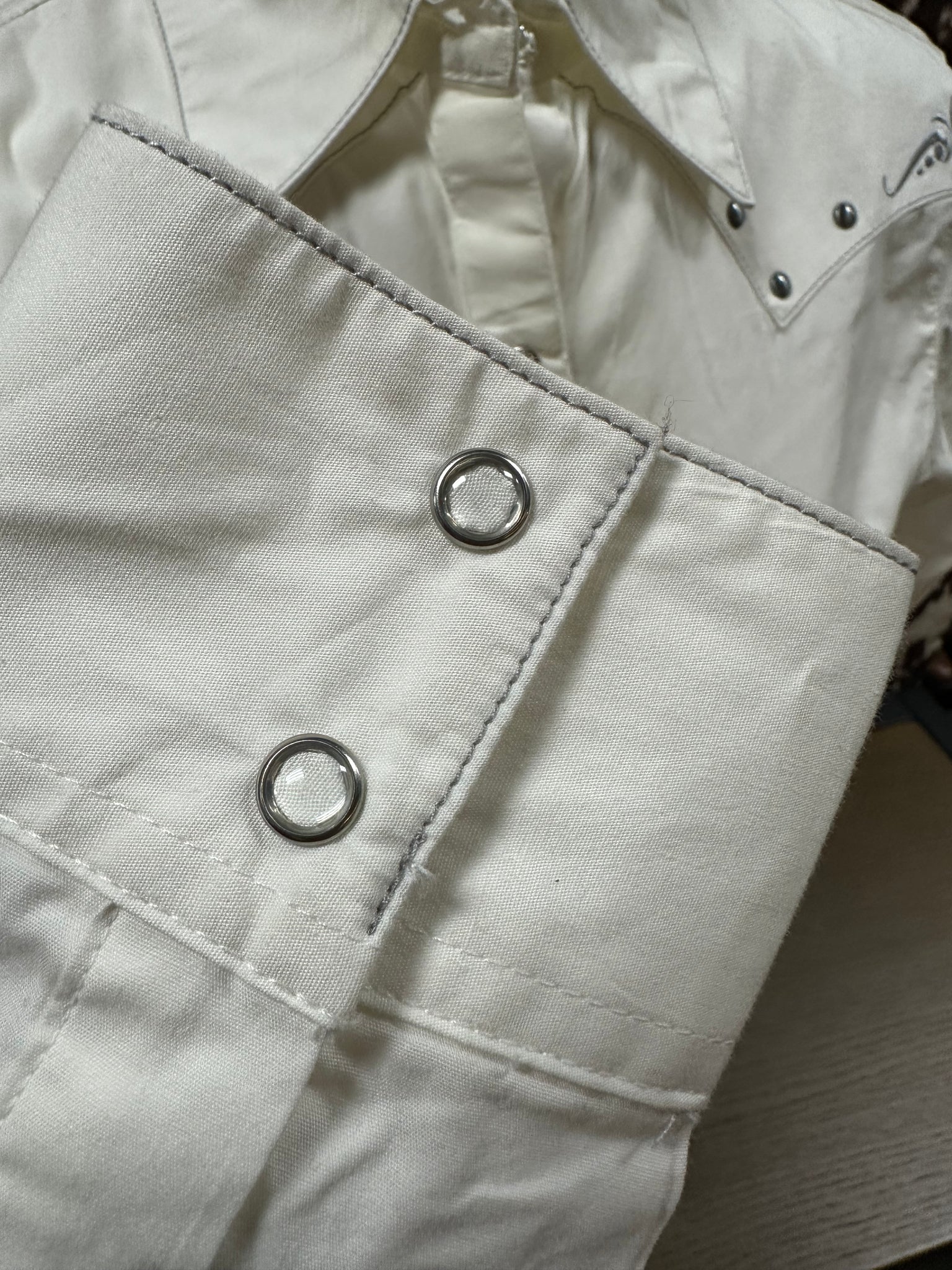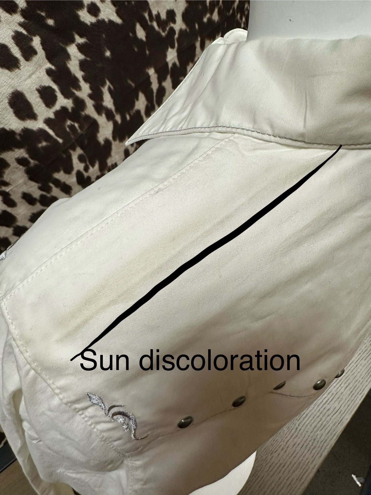 Condition: New with visible sun damage along the shoulder (where the hanger lies), has a stain on collar and on left upper sleeve.