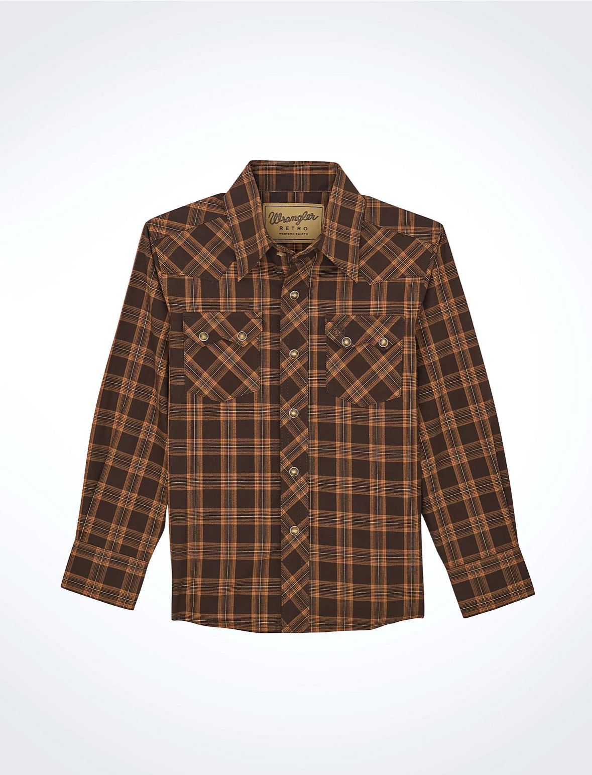 Fancy Western yokes, spread collar, and snaps give off cowboy-inspired plaid style. He'll look clean cut even when tumbling around in durable 100% cotton with contrast stitching.